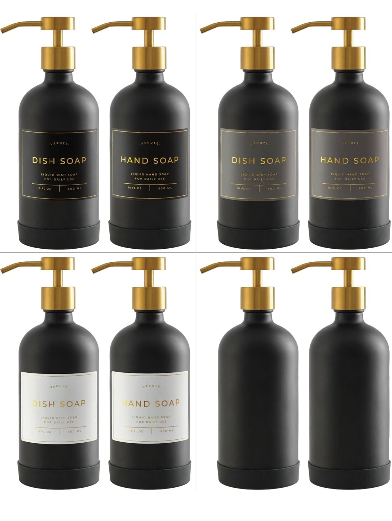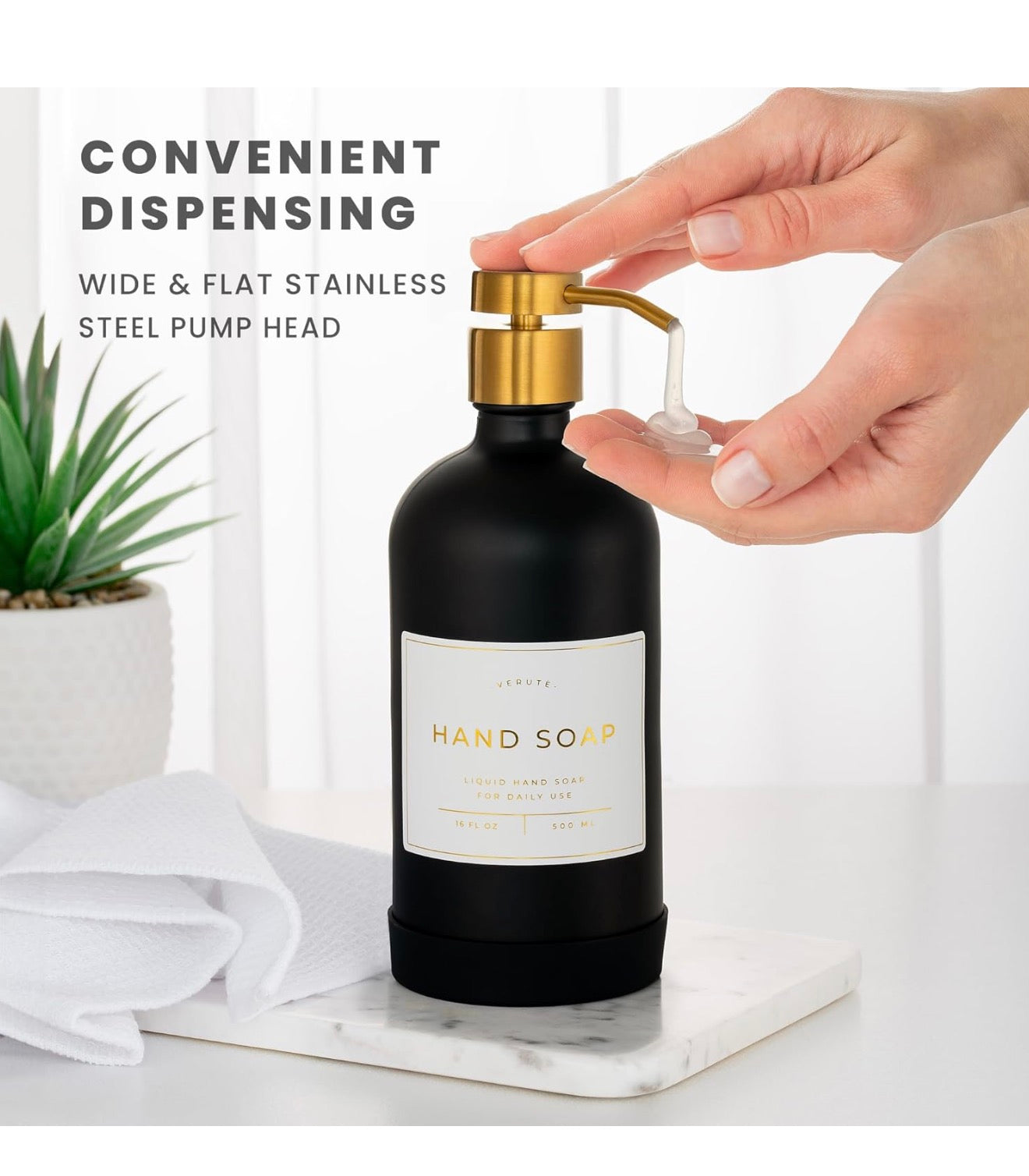 Hand and Dish Soap Dispenser for Kitchen and Bathroom, Set of 2 16 Oz Glass Bottles, Stainless Steel Pumps, Non-Slip Silicone Base, 27 Waterproof Labels (Matte Black Bottle/Brushed Gold Pump
